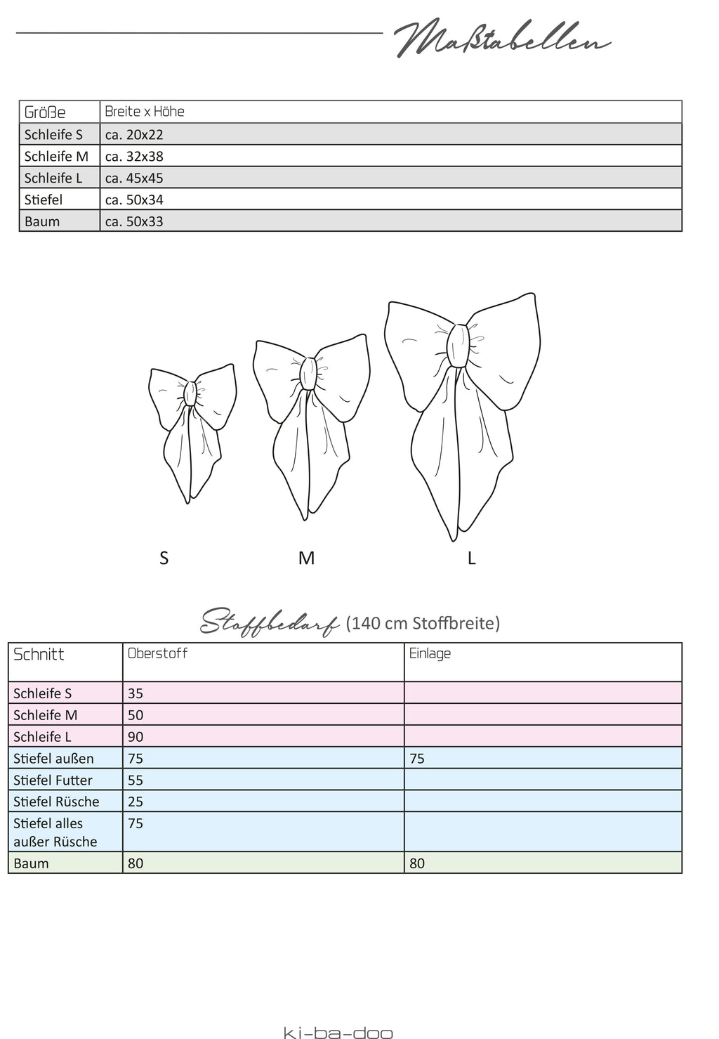 Das Calm Xmas Edit Schnittmuster bietet dir drei weihnachtliche Deko Projekte aus Webware. Du gestaltest Schleifen in drei Größen. Dazu kommt ein Nikolausstiefel mit zwei Abschlüssen. Krempe oder Rüschenkante. Ergänzt wird das Set durch ein weiches Tannenbaum Kissen. Die Schleifen sorgen für klare Akzente an Türen, Kränzen oder Geschenken.