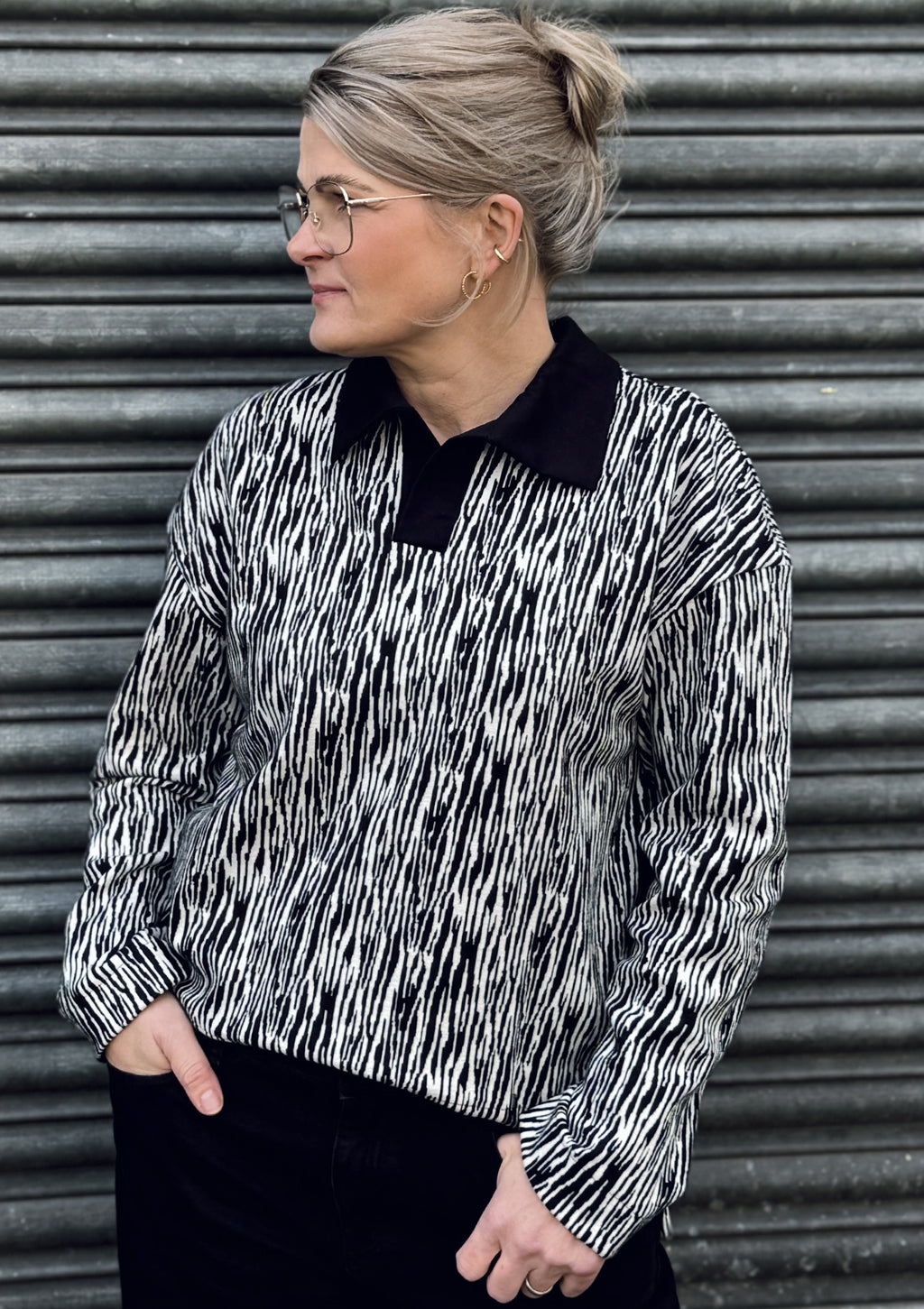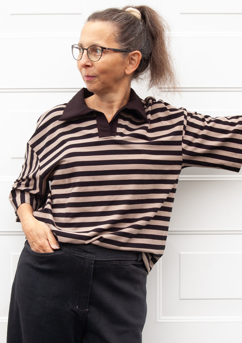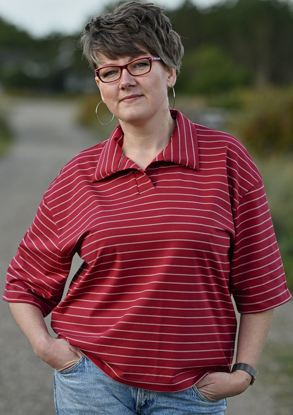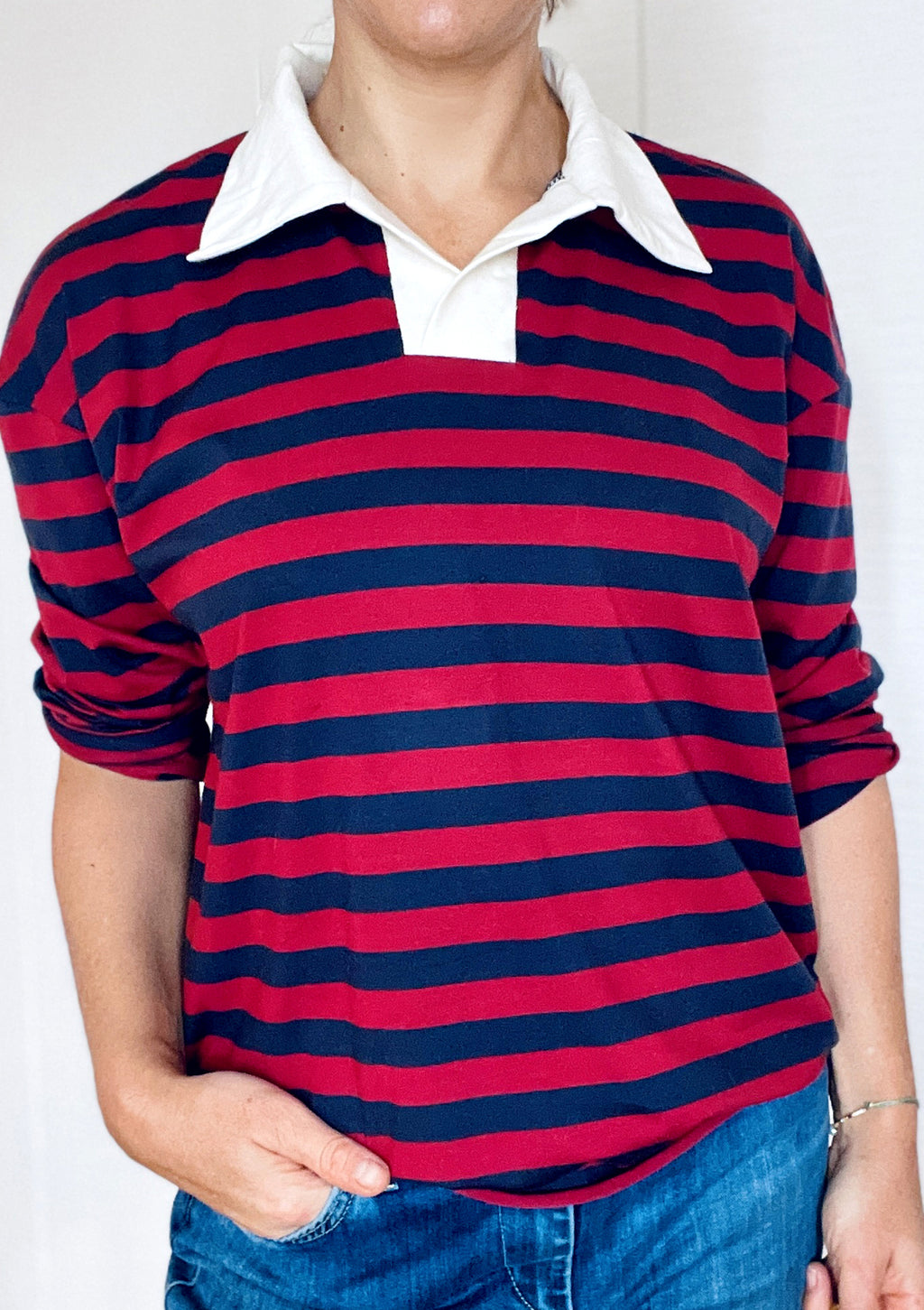 Dieses Schnittmuster bringt den klassischen Rugby-Look in deinen Kleiderschrank. Das Shirt hat eine legere Passform mit leicht überschnittenen Schultern.