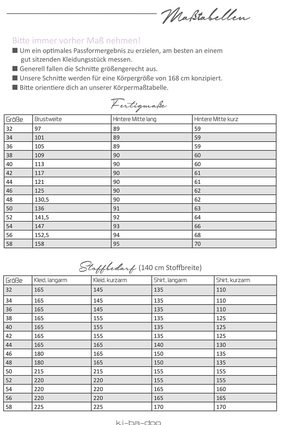 Das Schnittmuster beinhaltet die Grössen 32 - 58 als DIN A4-Datei und A0 Datei. Alle DIN A4-Schnittmusterteile sind als Nest in Farbe und zusätzlich in den Einzelgrössen in schwarz/weiss hinterlegt.